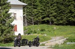 Nach der Grenze und einigen Kilometern durch das nächste Tal, fuhren wir über den Predil Pass und kreuzten die Grenze zu Slowenien. Während der Abfahrt ins Tal, fiel mehreren Fahrern das starke, seitliche Ausschlagen des Hinterrads am schwarzen Chief Gespann auf. Einige hundert Meter später, bot sich ein großer Parkplatz zum Halten an und wir konnten uns das Rad genauer anschauen. Der Schaden war sofort zu erkennen. Einige Speichen hatten sich gelockert, andere waren bereits gerissen. Eine schnelle Reparatur war ausgeschlossen. Nachdem wir erst etwa ein Viertel der Fahrtstrecke des Tages hinter uns hatten, wollten wir den Platz auf dem Anhänger des Servicefahrzeugs nicht mit dem Gespann alleine belegen und so den Transport anderer Motorräder unmöglich machen. In kurzer Zeit war der Beiwagen von der Chief getrennt und wurde in ein weiteres Begleitfahrzeug verladen. Die Chief kam auf den Anhänger und nach etwa einer Stunde konnten wir die Fahrt fortsetzen.